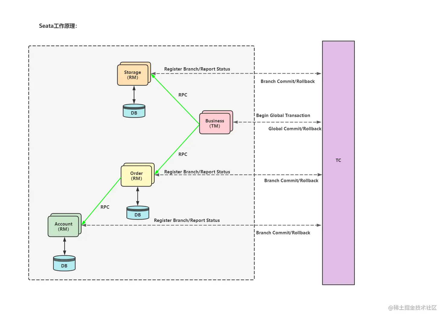 TC(事务协调者)注册一下,我们称为分支事务。相当于它的RM(资源管理器)会告诉TC(事务协调者),它有一个分支事务,并且它要实时汇报它的事务状态,它这个分支是提交成功还是失败回滚,TC(事务协调者)都能实时的知道。 - 接下来调我们第二个远程服务 Order,及第三个远程服务 Account也是同理注册分支事务,并且实时汇报状态。